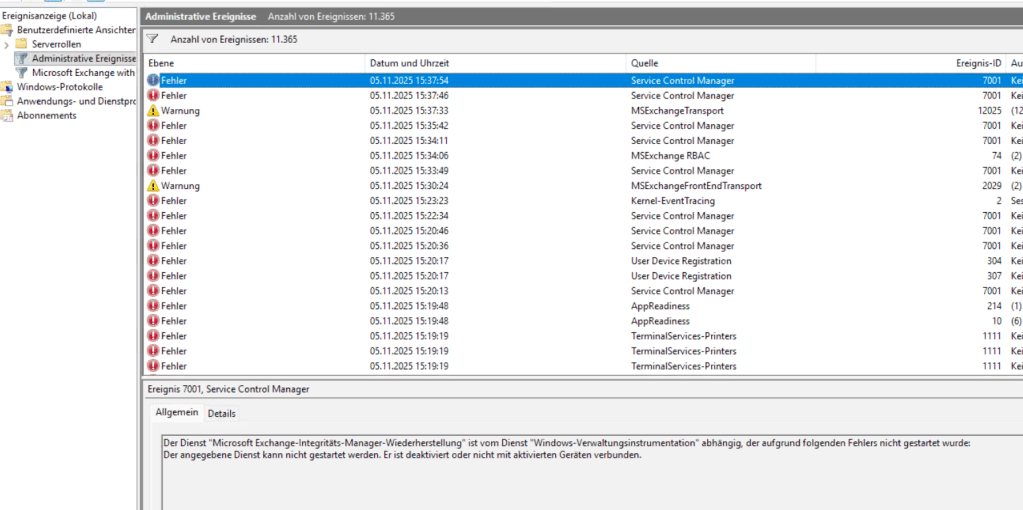 Allerdings waren bei uns nach dem Neustart fast alle Exchange-Dienste deaktiviert (!). Nach Umstellung auf „Aktiviert“ und „Starten“ per services.msc lief trotzdem noch nichts – so versagte u.a. der wichtige Exchange-Transport den Dienst, mit der Fehlermeldung: