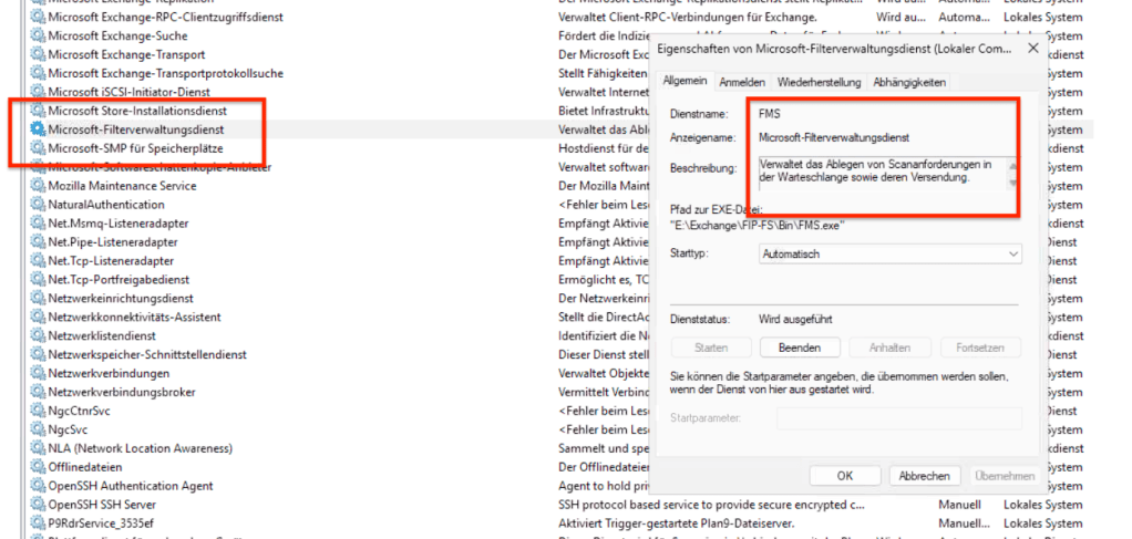 In den Logs liessen sich dann aber brauchbare Verweise auf diverse weitere, noch zu aktivierende Dienste finden – kurioserweise auch der Filterverwaltungsdienst, den man aufgrund des Stichworts „Scananforderungen“ auf den ersten Blick vielleicht nicht unbedingt mit dem Mailtransport eines Exchange-Servers in Verbindung bringt: