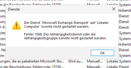 „Der Dienst ‚Microsoft Exchange-Transport‘ auf ‚Lokaler Computer‘ konnte nicht gestartet werden.